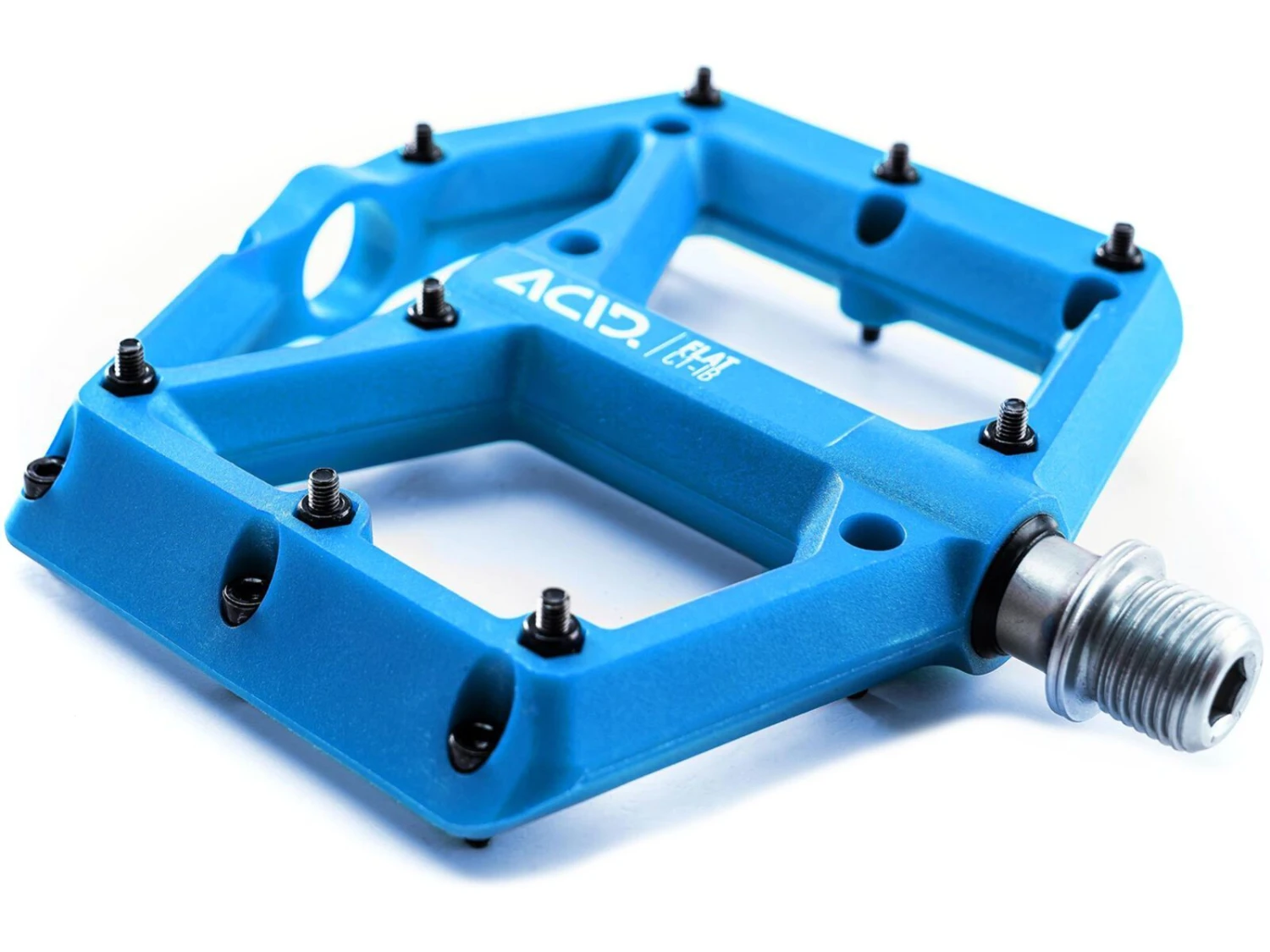 Hier im Bikepark kenne ich jeden Anlieger, jeden Sprung und jede Wurzel. Adrenalin pur! Auf meine Acid Flat C1-IB Pedale kann ich mich dabei voll verlassen. Mit ihren einstellbaren Pins und der großen Standfläche fühle ich mich auch im gröbsten Wurzelteppich sicher mit dem Bike verbunden und kann mich doch sofort davon lösen, wenn der Trick mal nicht so klappt wie geplant.