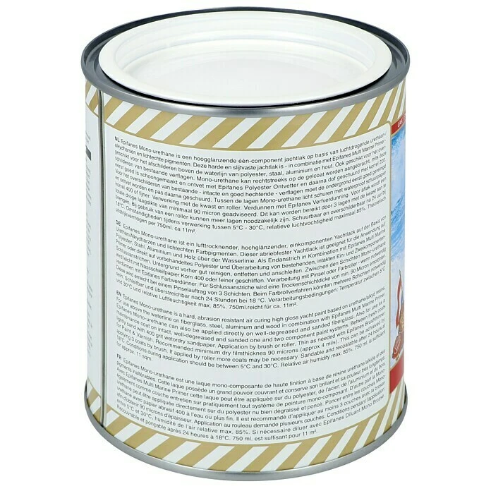 Der Yachtlack Mono-Urethan von Epifanes bietet überlegene Abdeckung und Füllung, lang anhaltende Wetterbeständigkeit und hohe Glanzhaltung. Die harte, einkomponentige, lufttrocknende und hochglänzende Lackierung auf Basis von Urethan/Alkydharzen eignet sich, unter Verwendung der entsprechenden Grundierung oder direkt auf gut entfetteter und geschliffener Glasfaser, zur Anwendung im Innen- und Außenbereich oberhalb der Wasserlinie. Der Yachtlack findet seine Anwandung auf Fiberglas-, Stahl-, Holz- und Aluminium Booten.