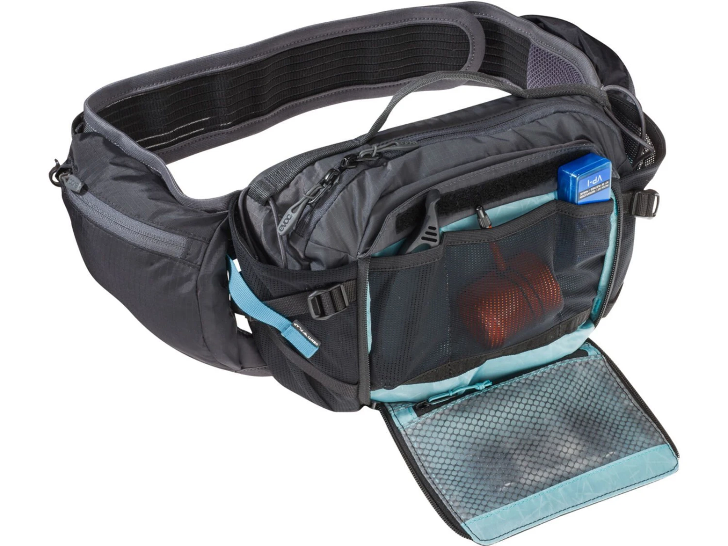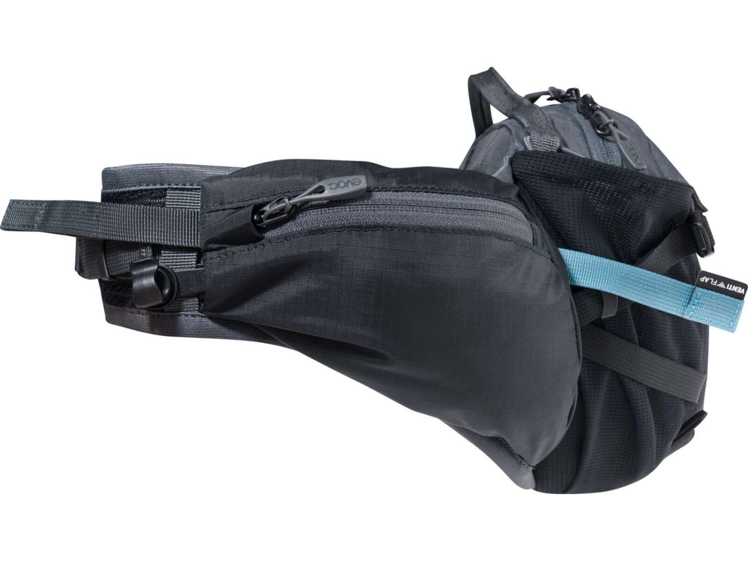 Die Evoc Hip Pack Pro 3l ist eine belüftete Hightech-Tragetasche, durch die der Rücken frei bleibt. Außer genug Platz für einen Schlauch, etwas Werkzeug und eine 1,5-Liter-Trinkblase bietet das Pack ein ausgeklügeltes System für ein Plus in Sachen Komfort: das Venti-Flap. Dabei wird beim Aufstieg der Abstand zum Rücken vergrößert und das Pack für den Weg ins Tal enger um die Hüfte gezurrt – einfach am Gurt ziehen, fertig!Features