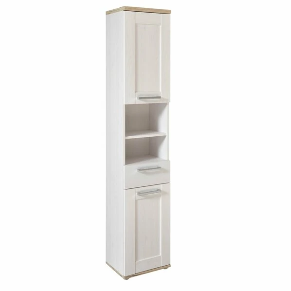 Werten Sie ihr Bad durch den Hochschrank im Landhausstil auf. Die Farbe des Korpus entspricht der einer Sibiu Lärche, die des Absatzes einer San Remo Eiche. Der Schrank zeichnet sich durch die Symbiose aus Sibiu Lärche und San Remo Eiche aus. Diese erzeugt einen wunderschönen Kontrast und lässt Ihr Bad in einem neuen Licht erstrahlen.