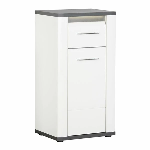 Der Unterschrank ALASSIO überzeugt durch sein modernes Design. Die Fronten in Weiß Hochglanz werden durch die Absetzungen in Matera dunkel perfekt abgerundet. Durch eine Tür und einen Schubkasten bietet der Unterschrank ausreichend Platz für deine Badutensilien. Ein Highlight ist die integrierte LED-Beleuchtung.