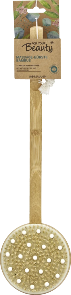 Genießen Sie mit der for your Beauty Bambus Massage-Bürste eine belebende Massage. Der Bürstenkopf besteht aus 100% Naturborsten & Spezialmassagenoppen, welche sich besonders gut für intensive Massagen eignen. Durch den gebogenen Griff ist er ein ideales Hilfsmittel um auch schwer erreichbare Köperbereiche wie den Rücken gründlich zu reinigen und zu massieren. Das Holz der Massagebürste besteht aus Bambus, welches aus vorbildlich bewirtschafteten Wäldern bezogen wird. Es wächst extrem schnell nach und hat von Natur aus eine antibakterielle Wirkung. Die Massagebürste entfernt alte Hautschuppen, fördert die Durchblutung und lockert das Muskelgewebe.