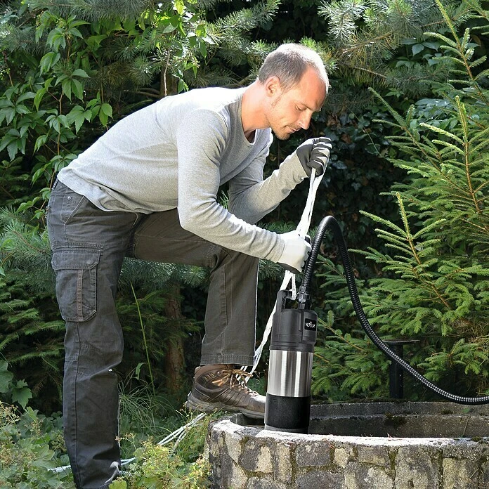 Die Neptun Tauchdruckpumpe NTP-E 110 schaltet sich durch die Automatikfunktion bei Wasseranforderung automatisch ein und aus. Die Pumpe sorgt für den nötigen Druck, um Klarwasser aus der Regenwasser-Zisterne, dem Wasserreservoir und -schacht oder dem Gartenbrunnen an die gewünschte Stelle zu befördern. Selbst eine Förderhöhe von maximal 45 Meter stellt für die Pumpe kein Problem dar. Bei einer Eintauchtiefe von maximal 12 Meter arbeitet sie mit 1.100 Watt im Dauerbetrieb und ist dank einer 15 Meter langen Netzleitung flexibel einsetzbar in Garten und heimischem Außenanlagen. Die maximale Fördermenge ist auf 6.000 Liter je Stunde ausgelegt. Die Tauchdruckpumpe macht nicht nur äußerlich einen soliden Eindruck, sie wurde besonders robust konstruiert und mit wichtigen Sicherheitsmerkmalen ausgestattet. So sorgt ein 4-stufiges Laufradsystem für einen extra hohen Förderdruck. Das Gehäuse ist aus rostfreiem Edelstahl und der Druckanschluss wurde mit einem Edelstahleinsatz ausgerüstet. Die hochwertige Gleitringdichtung ist Grundlage für eine lange Lebensdauer. Gut erreichbar ist der Schlauchanschluss der Größe 33,3 mm (1″ IG) an der Pumpenoberseite. Die integrierte Trockenlaufsicherung und der Überlastschalter bewahren die Pumpe vor Schäden bei Unterbrechung der Wasserzufuhr.