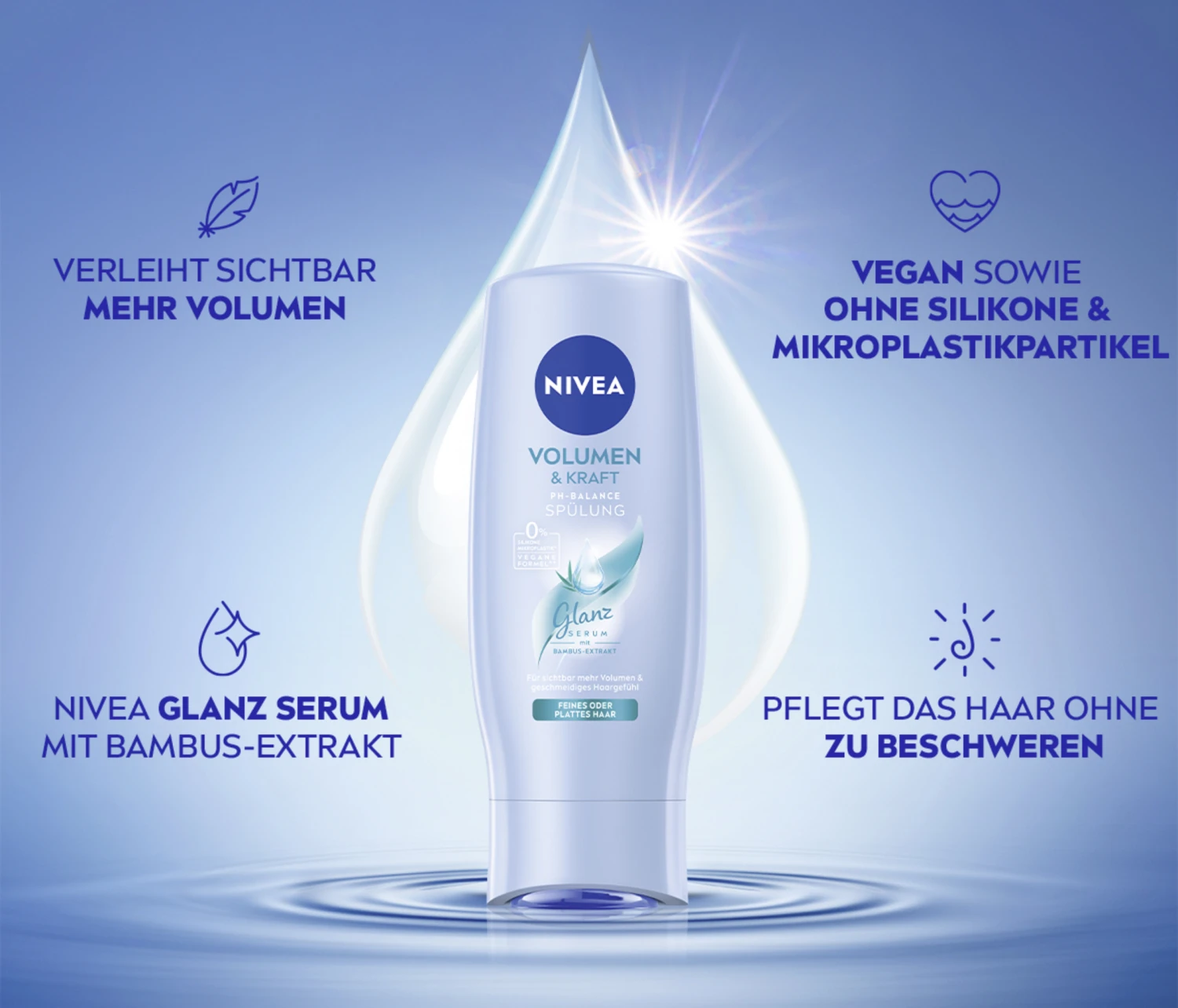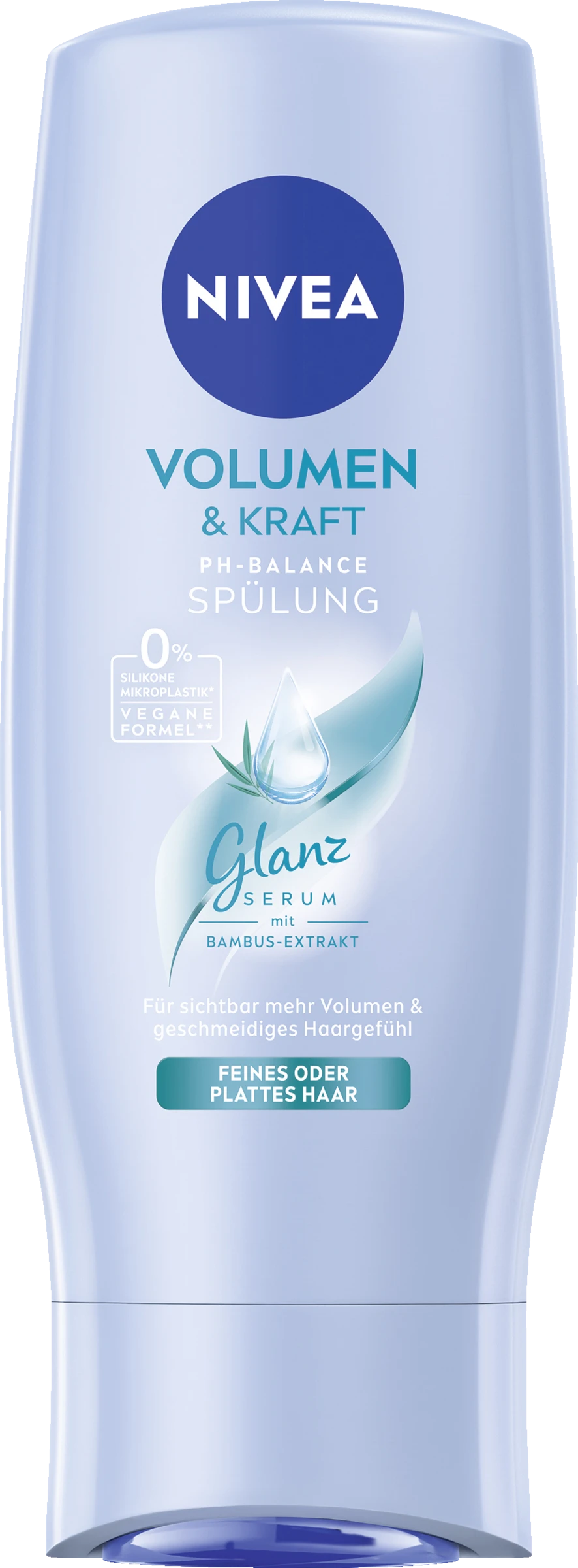 Verleih Deinem Haar Volumen und Kraft mit natürlichem Glanz. Die Volumen & Kraft Spülung mit Nivea Glanz Serum und Bambusextrakt verleiht sichtbares Volumen und strahlenden natürlichen Glanz. Die Formel mit dermatologisch bestätigter Hautverträglichkeit harmoniert mit dem natürlichem pH-Wert von Haar und Kopfhaut und verleiht durch das wertvolle Nivea Glanz Serum gesundes, natürlich schönes Haar: Nivea Volumen & Kraft Spülung.