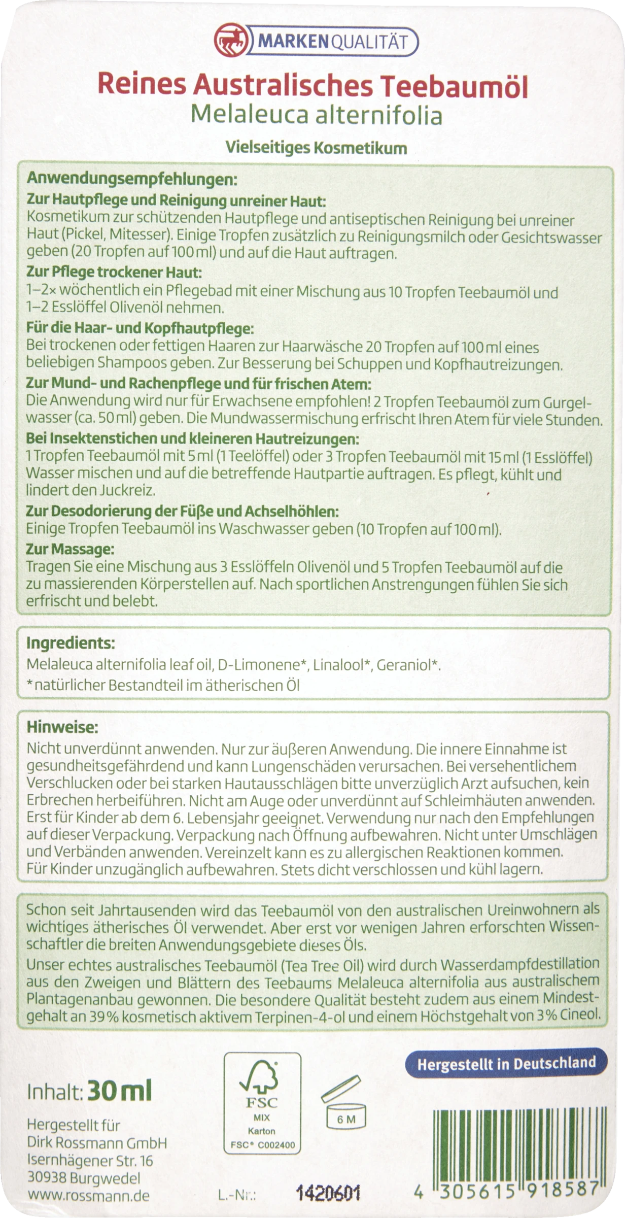Nicht unverdünnt anwenden. Nur zur äußeren Anwendung. Die innere Einnahme ist gesundheitsgefährdend und kann Lungenschäden verursachen. Bei versehentlichem Verschlucken oder bei starken Hautausschlägen bitte unverzüglich Arzt aufsuchen, kein Erbrechen herbeiführen. Nicht am Auge oder unverdünnt auf Schleimhäuten anwenden. Erst für Kinder ab dem 6. Lebensjahr geeignet. Verwendung nur nach den Empfehlungen auf dieser Verpackung. Verpackung nach Öffnung aufbewahren. Nicht unter Umschlägen und Verbänden anwenden. Vereinzelt kann es zu allergischen Reaktionen kommen.